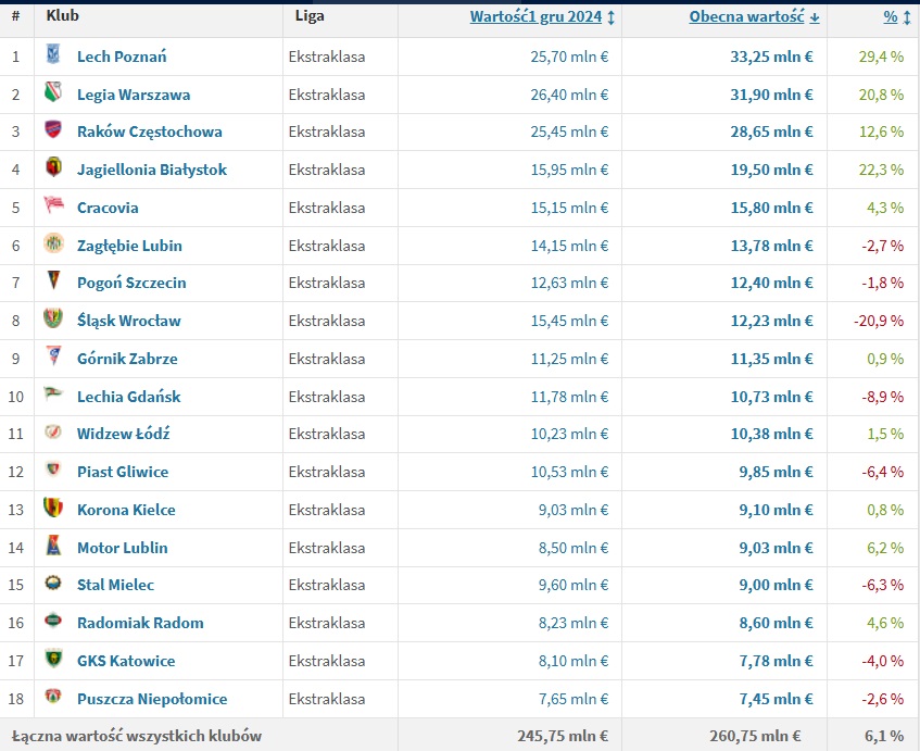 W taki sposób prezentuje się szacunkowa wartość każdego z klubów Ekstraklasy. Śląsk Wrocław może się pochwalić niechlubną statystyką, ponieważ procentowo stracił najwięcej z całej ligi - aż 20,9%