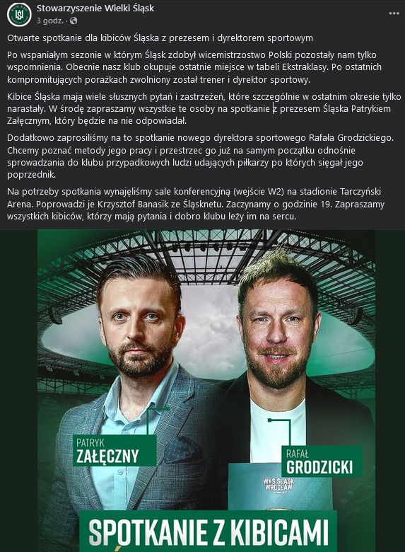 W najbliższą środę (20 listopada) kibice Śląska Wrocław będą mogli uczestniczyć w otwartym spotkaniu z prezesem klubu, Patrykiem Załęcznym, oraz nowym dyrektorem sportowym, Rafałem Grodzickim. Wydarzenie to odbędzie się w sali konferencyjnej (wejście W2) na Tarczyński Arena o godzinie 19:00. Celem jest omówienie aktualnej sytuacji Śląska. Zwolnienia trenera i dyrektora sportowego mogły zrodzić kolejne zastrzeżenia, oraz pytania dla fanów WKS-u. Wszyscy chętni kibice mogą przyjść, aby osobiście zapytać osoby z klubu o m.in. jego przyszłość czy obecną wizję. Całe wydarzenie poprowadzi redaktor naczelny Śląsknetu — Krzysztof Banasik. Relacja ze spotkania pojawi się na naszej stronie.