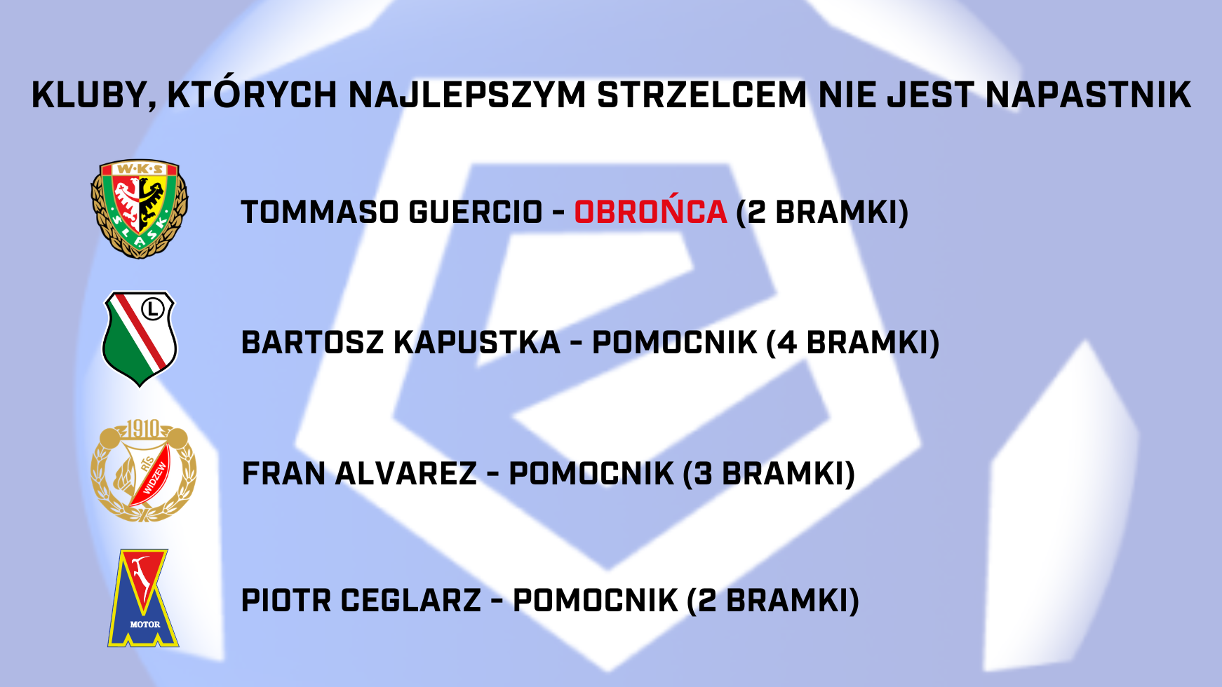 Chciałbym jeszcze poruszyć wątek napastnika. W ostatnim meczu z Pogonią Szczecin (3:5) Sebastian Musiolik w końcu trafił do siatki. To jednak nie daje 28-latkowi prowadzenia w klubowej klasyfikacji strzelców. Obecnie najlepszym strzelcem Śląska w lidze jest... obrońca Tommaso Guercio. To jedyny taki przypadek w lidze. Trójkolorowi są jednym z czterech zespołów w Ekstraklasie, których najlepszym strzelcem nie jest napastnik (mowa o sytuacji, w której jedna osoba ma najwięcej bramek). W pozostałych przypadkach najwięcej bramek zdobyli pomocnicy.