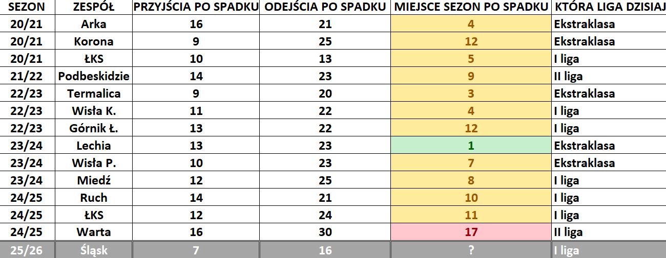 Przed Śląskiem Wrocław walka o powrót do Ekstraklasy. Ostatnie lata pokazują, że o to nie jest tak łatwo. Zobaczcie, jak spadkowicze z poprzednich lat radzili sobie z realiami I ligi i co może spotkać Trójkolorowych.